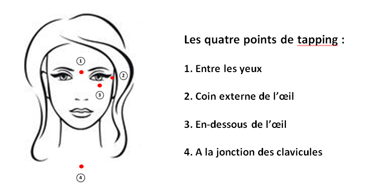 Ensuite, la technique de Faster EFT à proprement parler démarre : je vais tapoter avec le bout de mes doigts quatre points précis sur le haut de votre